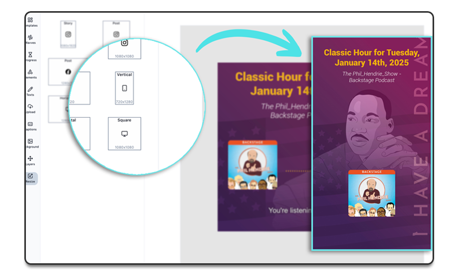 - Create once, share everywhere. Wavve’s auto-resizing adapts your content to fit any social channel flawlessly.
