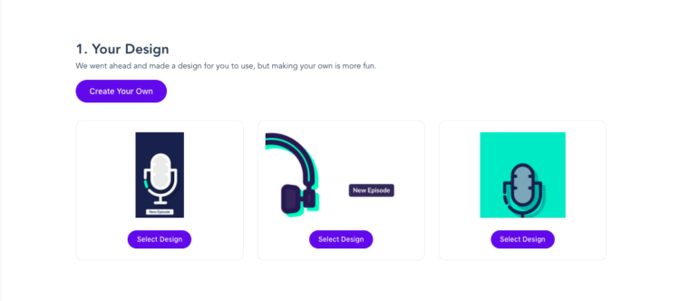4) Once you’ve selected your template, you’ll be taken to the Customize Your Template page. If you’re a podcaster, you can link your podcast here. Once you’ve linked it, the system will pull data from your RSS (like you cover image and details from your latest episode) and use that data to automatically populate fields. If you’re not a podcaster or you don’t have your podcast up on Apple, no worries. You can manually upload images and fill in the fields yourself.