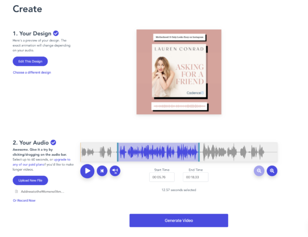 Notre outil en ligne, Wavve, facilite la combinaison d’une image, d’un clip audio, d’une animation et d’un texte pour créer facilement des fichiers vidéo MP4 pour le partage social. Wavve propose des modèles spécifiques qui permettent d’optimiser la durée des vidéos pour des plateformes de médias sociaux spécifiques, notamment… comme vous l’avez deviné, Facebook. Écoutez cet échantillon directement depuis notre page Facebook: